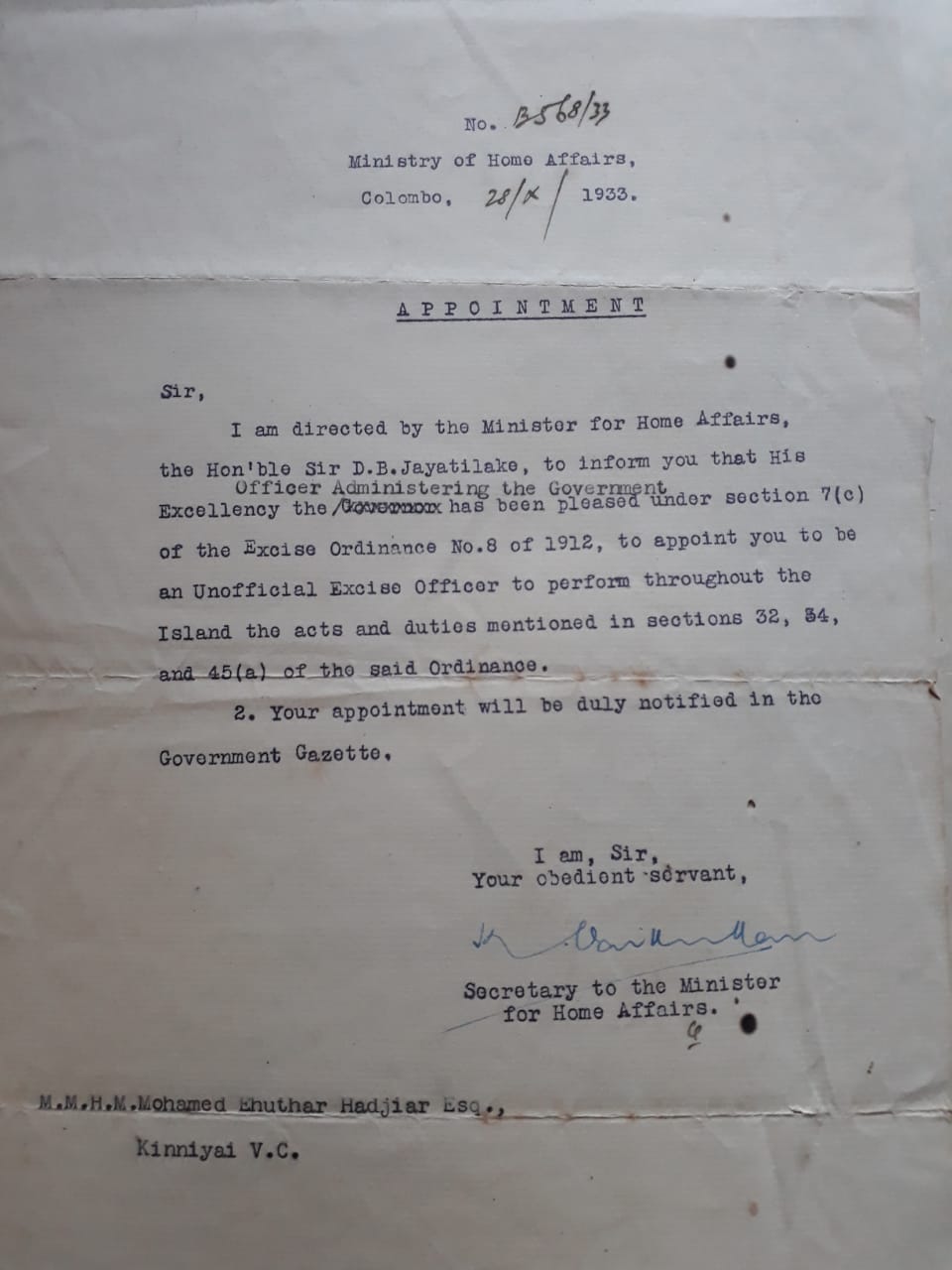 இதனைவிட 1933ஆம் ஆண்டு அப்போதைய உள்நாட்டலுவல்கள் அமைச்சர் சேர் டி.பீ. ஜெயதிலக்கவினால் உத்தியோகப் பற்றற்ற வரி அலுவலராக நியமிக்கப்பட்டார்.