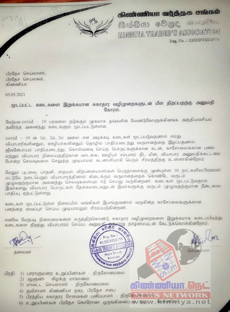 தமது வியாபார நிலையங்கள் மூடப்பட்டதனால் தாம் பாரியளவில் நஷ்டமடைந்துள்ளதாகவும் இறுக்கமான சுகாதார நடைமுறைகளை பேணி கடைகளை திறக்க அனுமதிக்குமாறும் கிண்ணியா வர்த்தக சங்கத்தினர் பிரதேச செயலாளரிடம் கோரிக்கை விடுத்துள்ளனர்.