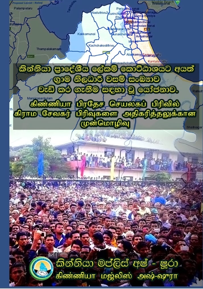 இந்த பிரிப்பான் அதே 32 வருடங்களுக்கு முன் செய்யப்பட்ட ஒரு பிரிப்பாகும். எனவே மக்களுடைய சனத்தொகை அதிகரிப்பு வாழ்வாதார பிரச்சினைகள் போன்ற பல்வேறு விடயங்களையும் கவனத்திற் கொண்டு நிர்வாக ரீதியான இலகுவாக்குமைக்காக 60 கிராம சேவகர் பிரிவுகளா க அதிகரிக்க வேண்டும். என்ற கோரிக்கையினை கிண்ணியா சூரா சபை முன் வைத்துள்ளது.