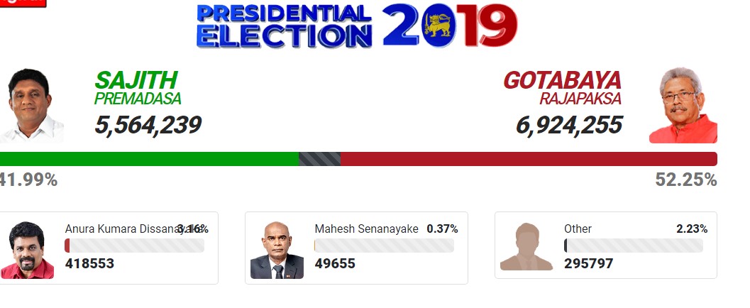 இவற்றில் பொதுஜன பெரமுனவின் சார்பில் களமிறங்கிய ஜனாதிபதி வேட்பாளர் கோட்டாபய ராஜபக்ஸ 6,924,255 வாக்குகளைப் பெற்று வெற்றி பெற்றுள்ளதாக தேசிய தேர்தல்கள் ஆணைக்குழுவின் தலைவர் மஹிந்த தேஷப்பிரிய அறிவித்துள்ளார்.