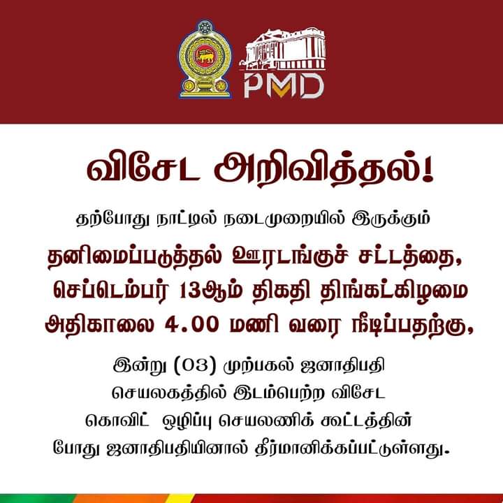 இலங்கையில் தற்போது நடைமுறையில் உள்ள நாடு தழுவிய கொரோனா ஊரடங்கு மேலும் ஒரு வாரம் நீட்டிக்கப்பட்டுள்ளது. 2021 செப்டம்பர் 13 ஆம் தேதி காலை 04.00 மணி வரை ஊரடங்கு நீட்டிக்கப்பட்டுள்ளதாக சுகாதார அமைச்சர் கெஹெலிய ரம்புக்வெல்ல அறிவித்தார்.