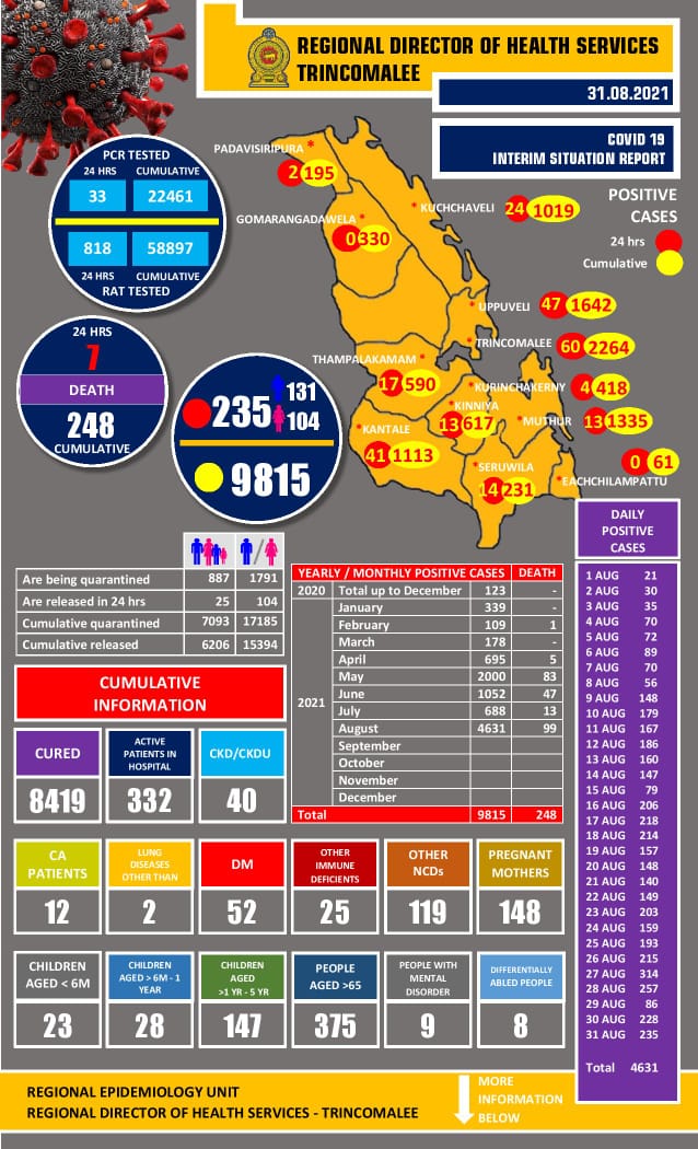 திருகோணமலை மாவட்டத்தில் 147 சிறுவர்களும் 148; கர்ப்பிணித் தாய்மார்களும் கொரோனா தொற்றினால் பாதிக்கப்பட்டுள்ளதாக திருகோணமலை பிராந்திய சுகாதார சேவைகள் பணியகம் தெரிவித்துள்ளது.