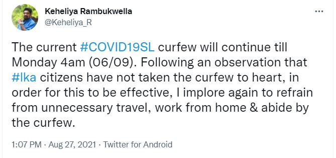 #BREAKINGNEWS தனிமைப்படுத்தல் ஊரடங்கு சட்டம் இன்னும் ஒரு வார காலத்திற்கு (06-09-2021 4 AM வரை) நீடிக்கப்பட்டது. #lockdown #COVID19SL