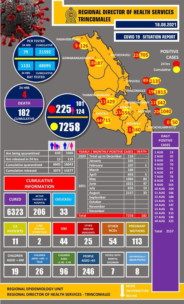 கடந்த 24 மணிநேரத்தில் திருகோணமலையில் 225 பேருக்கு கொரோனா தோற்று; நான்கு பேர் மரணம்